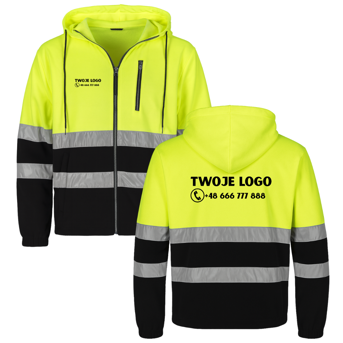 Bluza POLSTRIP-HD z nadrukiem Twojego logo, wykonana z polaru 280 g/m², zapewnia ciepło i wygodę. Posiada trzy kieszenie na suwak, kaptur regulowany troczkami oraz elastyczne wykończenia rękawów i kaptura. Fluorescencyjna tkanina i pasy odblaskowe zwiększają widoczność. Fason REGULAR gwarantuje komfort noszenia, idealny do pracy terenowej i transportowej.