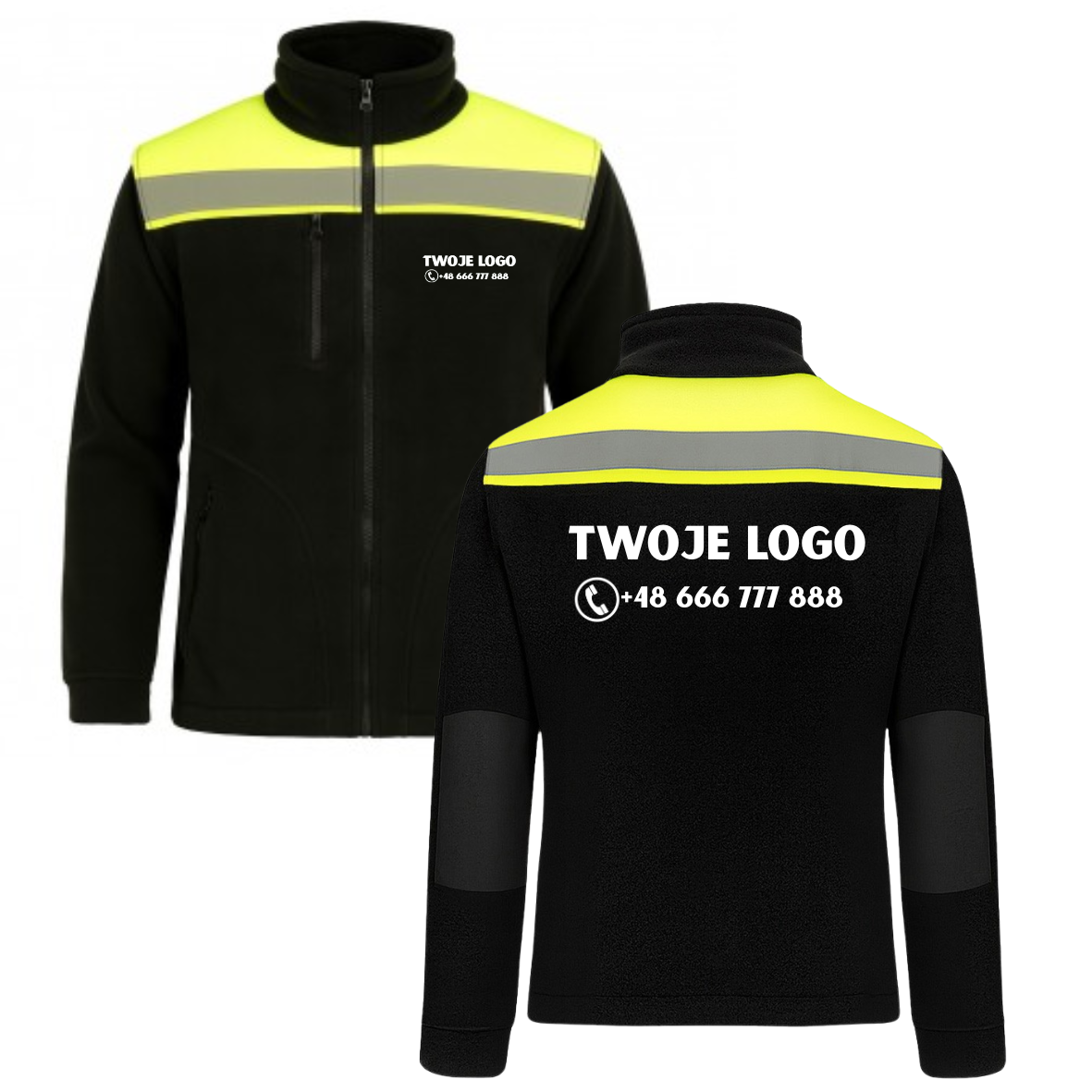 Polar ostrzegawczy HI VISION z nadrukiem Twojego logo wykonany z polaru 100% poliester o gramaturze 340–360 g/m², z odblaskowym pasem i jaskrawą seledynową górą zwiększającą widoczność. Wykończenie antypilingowe zapewnia trwałość. Wyposażony w zamek kostkowy, dwie kieszenie boczne i kieszeń na piersi, regulację w pasie oraz mankiety. Wzmocnienia na ramionach i rękawach chronią przed przetarciami. Idealny dla pracowników budowlanych, logistycznych i terenowych.